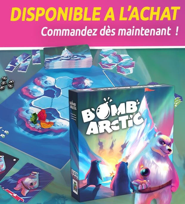 Dans BOMBARTIC, vous participez à une course effrénée, entre animaux de la banquise, avec pour objectif d’atteindre le sommet de l’Iceberg avant vos adversaires. Tour après tour, cases après cases, tracez votre chemin tout en empêchant vos concurrents de vous dépasser. Le premier a arrivé en haut gagne la partie. Evidemment, entre les avalanches, les poissons et les bombes, ça n’est pas une promenade de santé. Vous devez faire preuve d’équilibre et de savoir-faire pour rester dans la course sans tomber à l’eau.